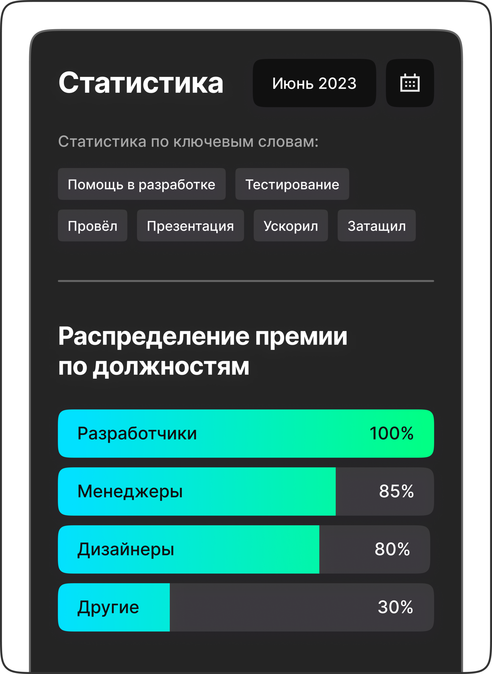 Наш сервис позволяет оптимизировать ФОТ под результат, а также повышает мотивацию команды.