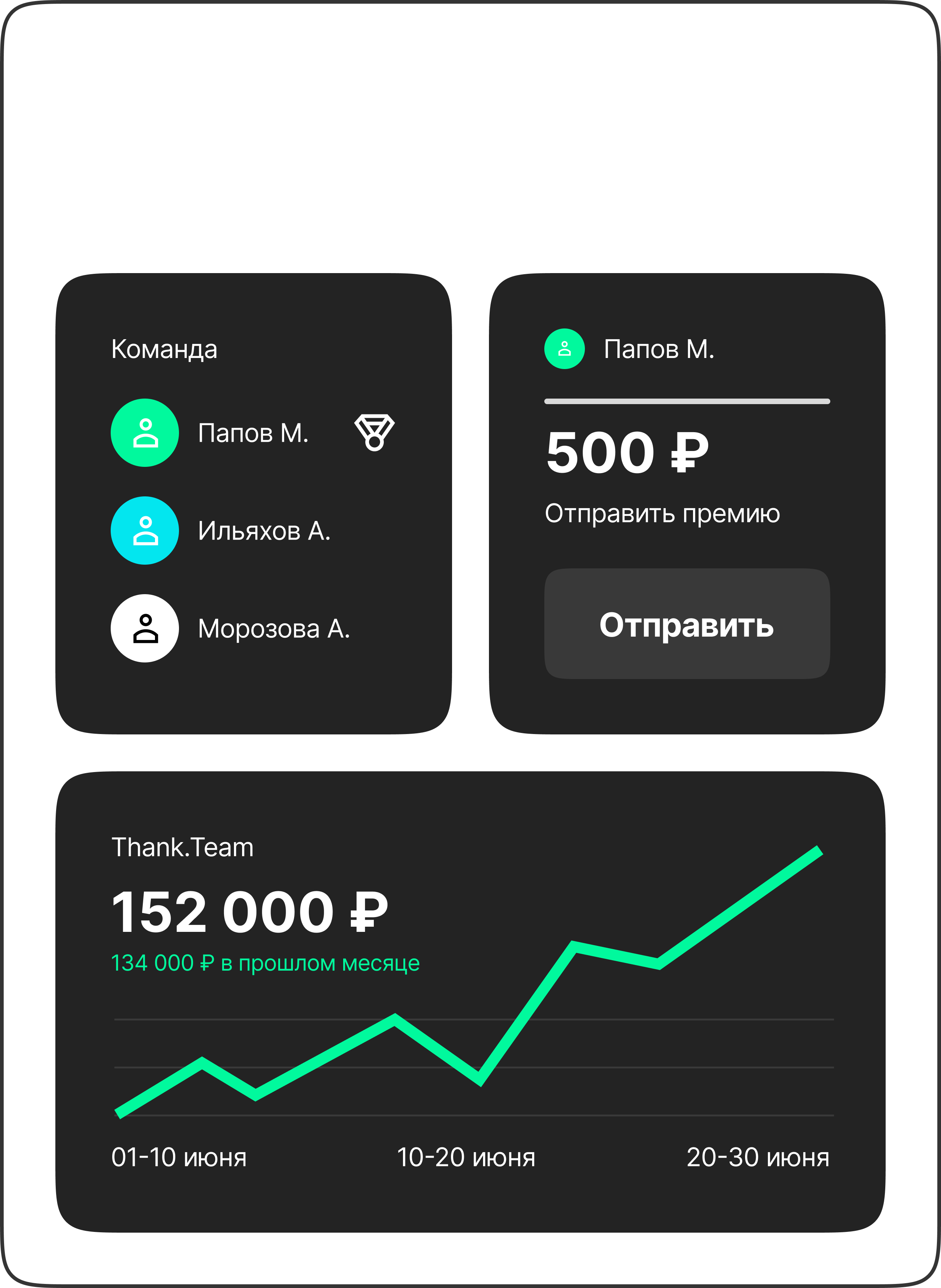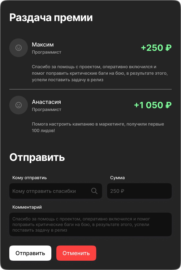Каждый сотрудник получает бюджет от компании — реальные деньги. Вывести их нельзя, перевести себе нельзя, но поблагодарить коллег за работу можно. Сотрудник сам решает кому, сколько и за что переводить деньги.